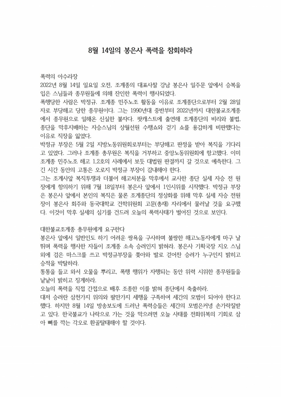봉은사 승려 특수집단 폭행대책위원회 성명서 페이지 정보 작성자 종교와젠더연구소 작성일22-09-15 12:36 조회2,823회 댓글0건 본문 댓글목록 등록된 댓글이 없습니다. 이전글 다음글 목록